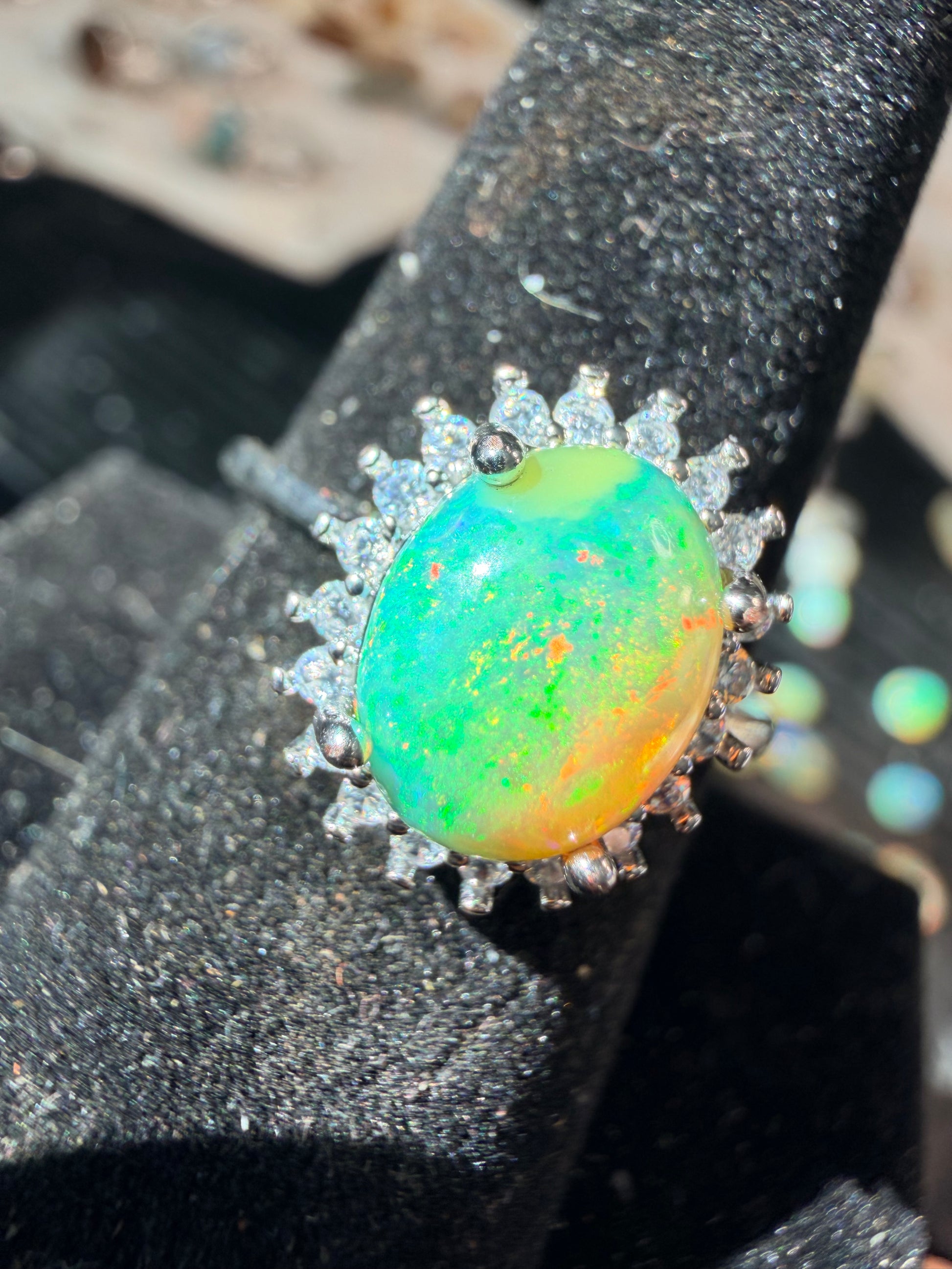 1.7 carat Ethiopian opal adjustable ring set in 925 silver. Green, orange, and yellow flash in a green base stone. Stone size is approx. 10.1mm x 7.9mm. Reminder, I'm not a jeweler and these rings were originally made for just me. I prefer the stones natural looking with possible matrix, inclusions or some polishing scratches. These are all created from rough rocks that I grind and polish into cabs. Ethiopian opals are hydrophane, meaning they will absorb water. It’s recommended to take these off when showering, washing hands, etc.