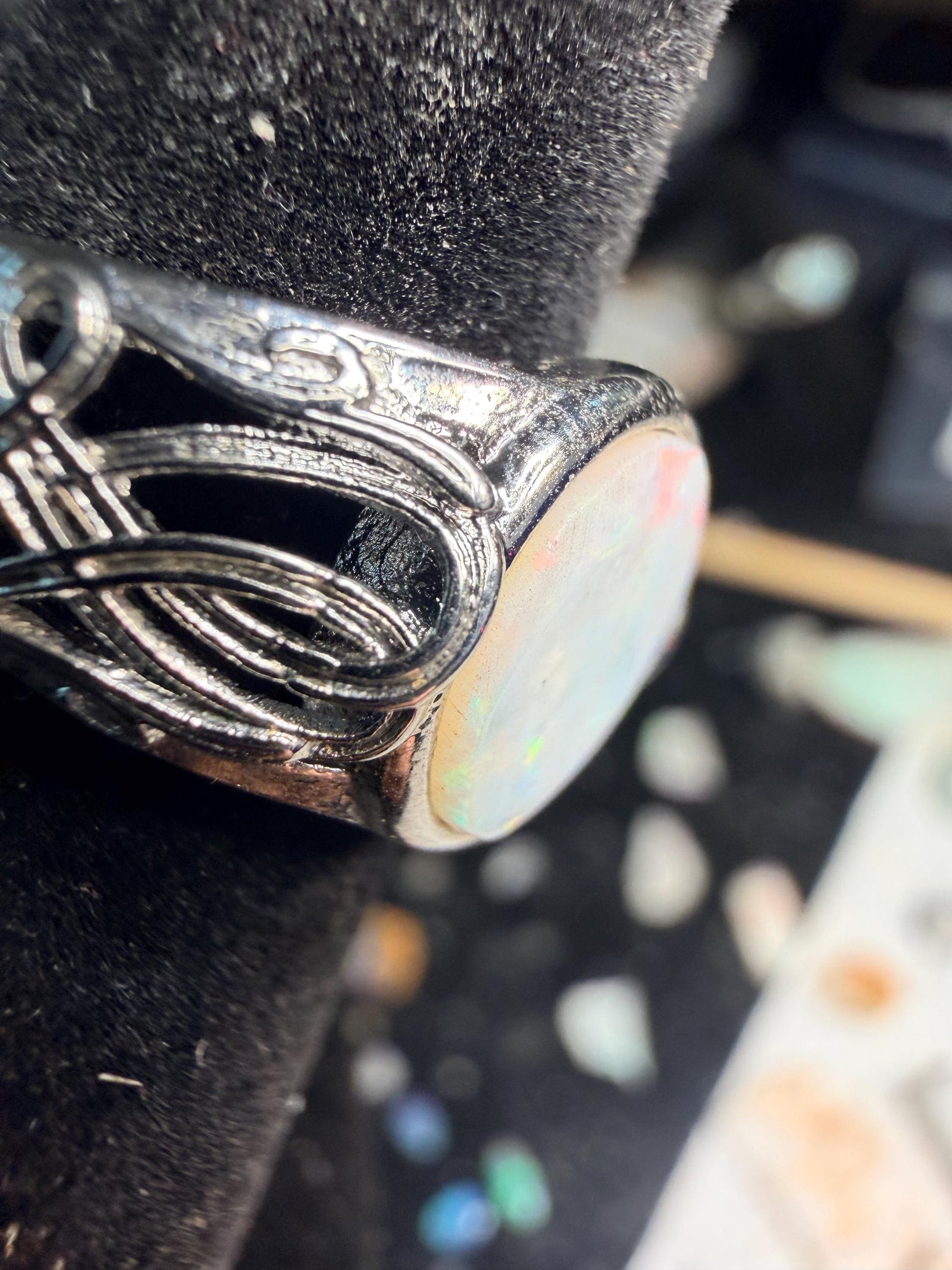 1.8 carat Australian opal adjustable ring, stone from Coober Pedy. Stone is a white base with rainbows underneath. Stone size is approx. 10mm diameter. Reminder, I'm not a jeweler and these rings were originally made for just me. I prefer the stones natural looking with possible matrix, inclusions or some polishing scratches. These are all created from rough rocks that I grind and polish into cabs.