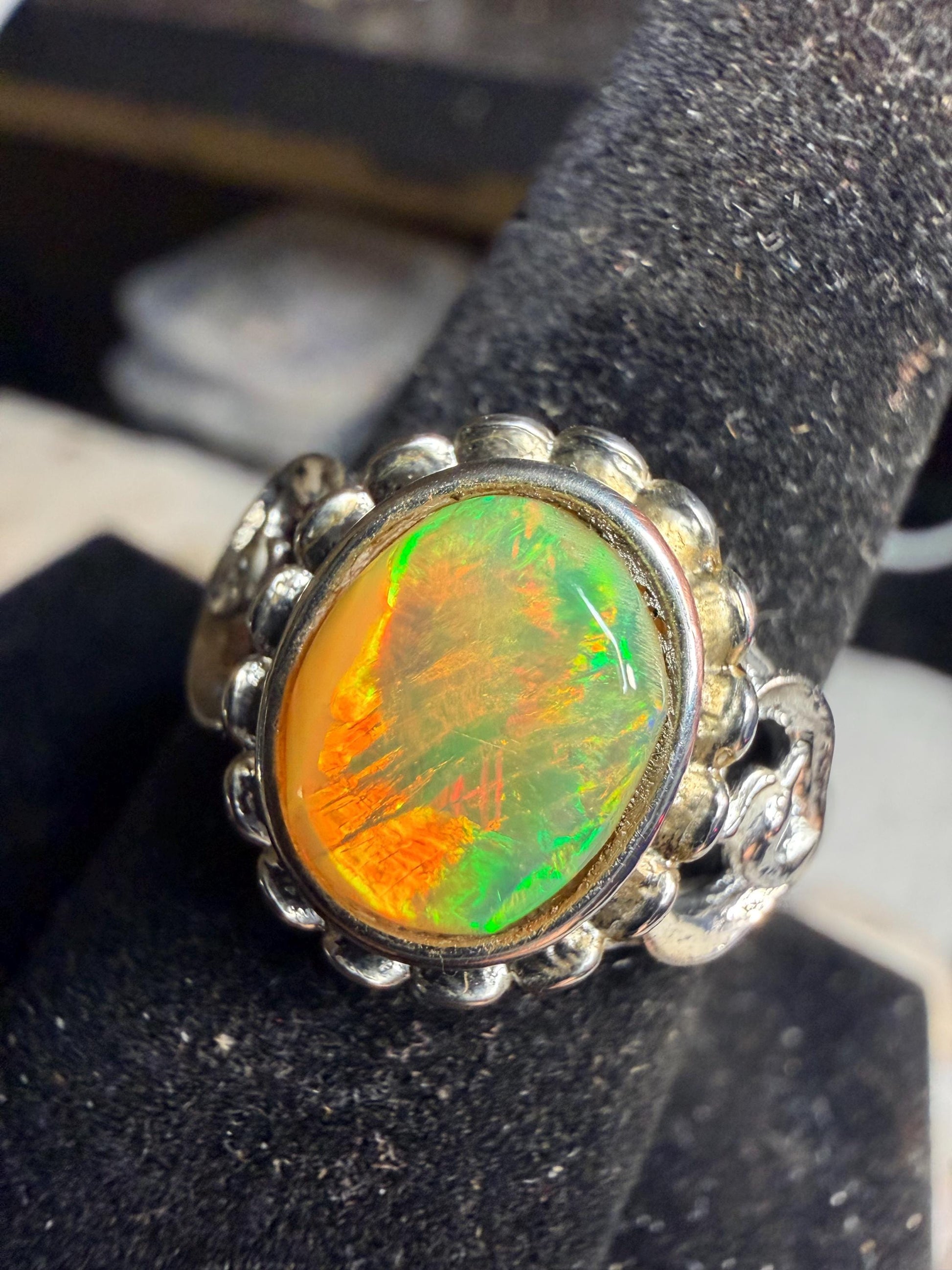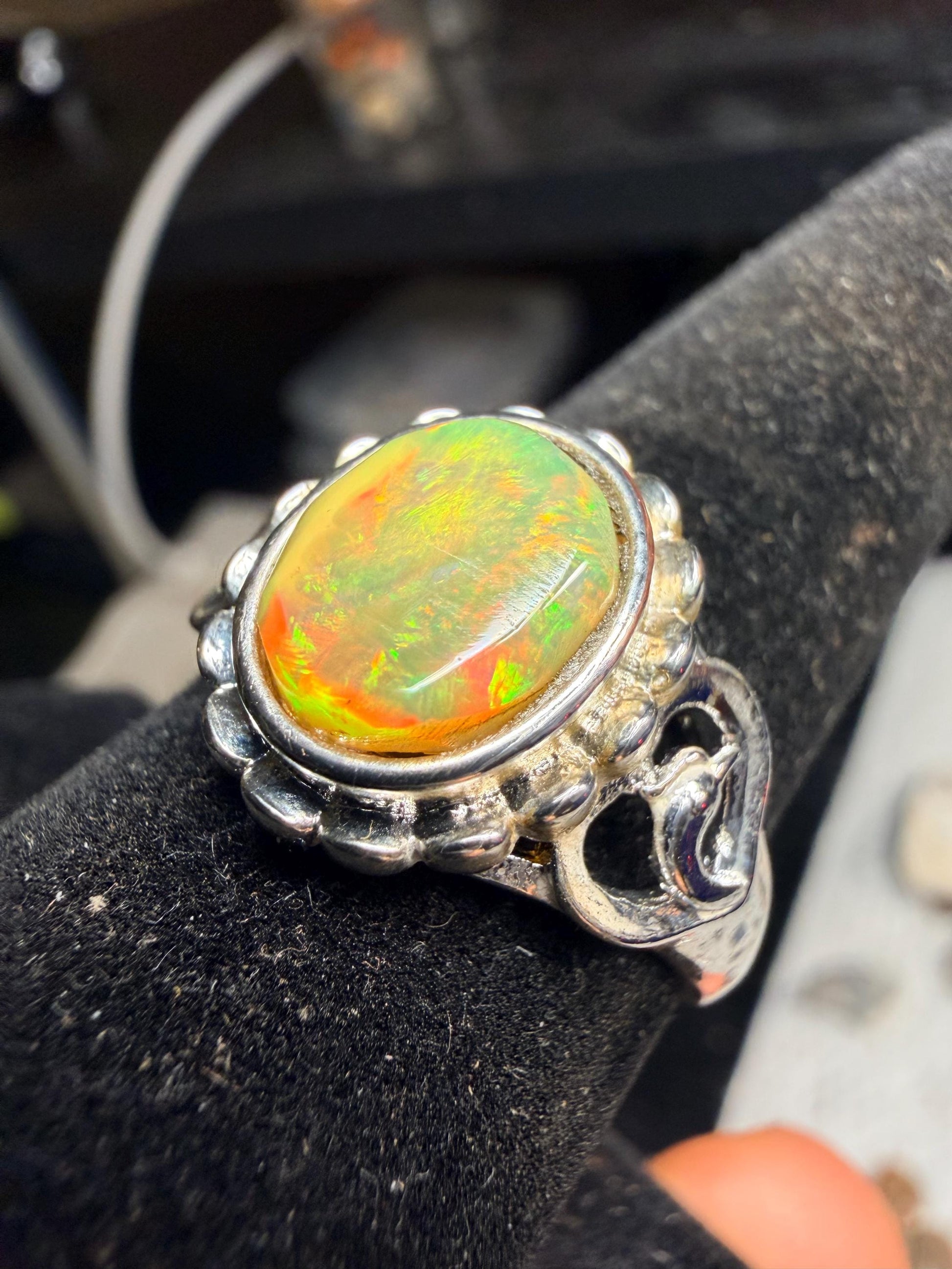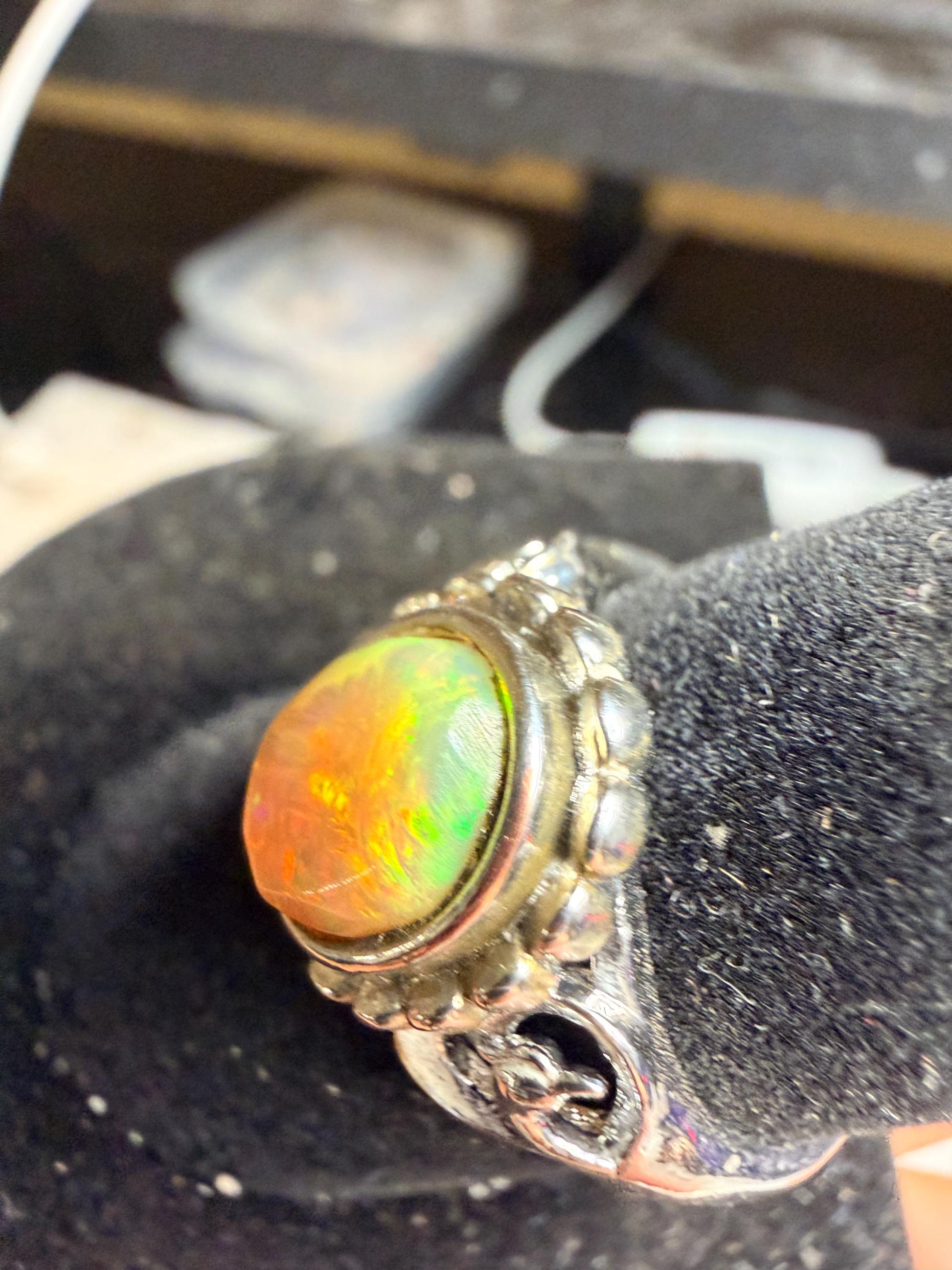1.9 carat Ethiopian adjustable ring. Stone size is approx. 9.4mm x 7.5mm. Gorgeous flash! Reminder, I'm not a jeweler and these rings were originally made for just me. I prefer the stones natural looking with possible matrix, inclusions or some polishing scratches. These are all created from rough rocks that I grind and polish into cabs. Ethiopian opals are hydrophane, meaning they will absorb water. It’s recommended to take these off when showering, washing hands, etc.