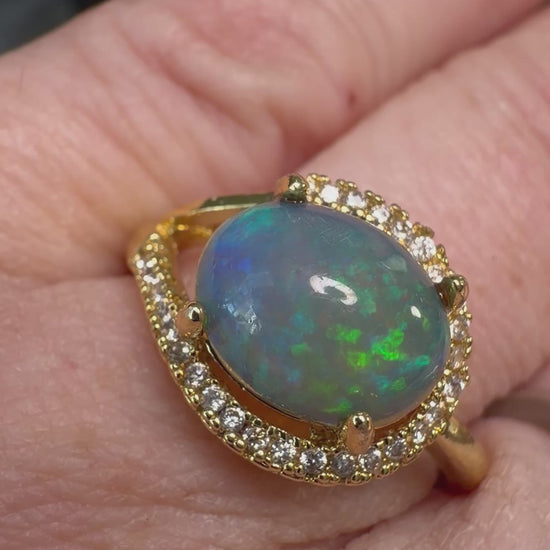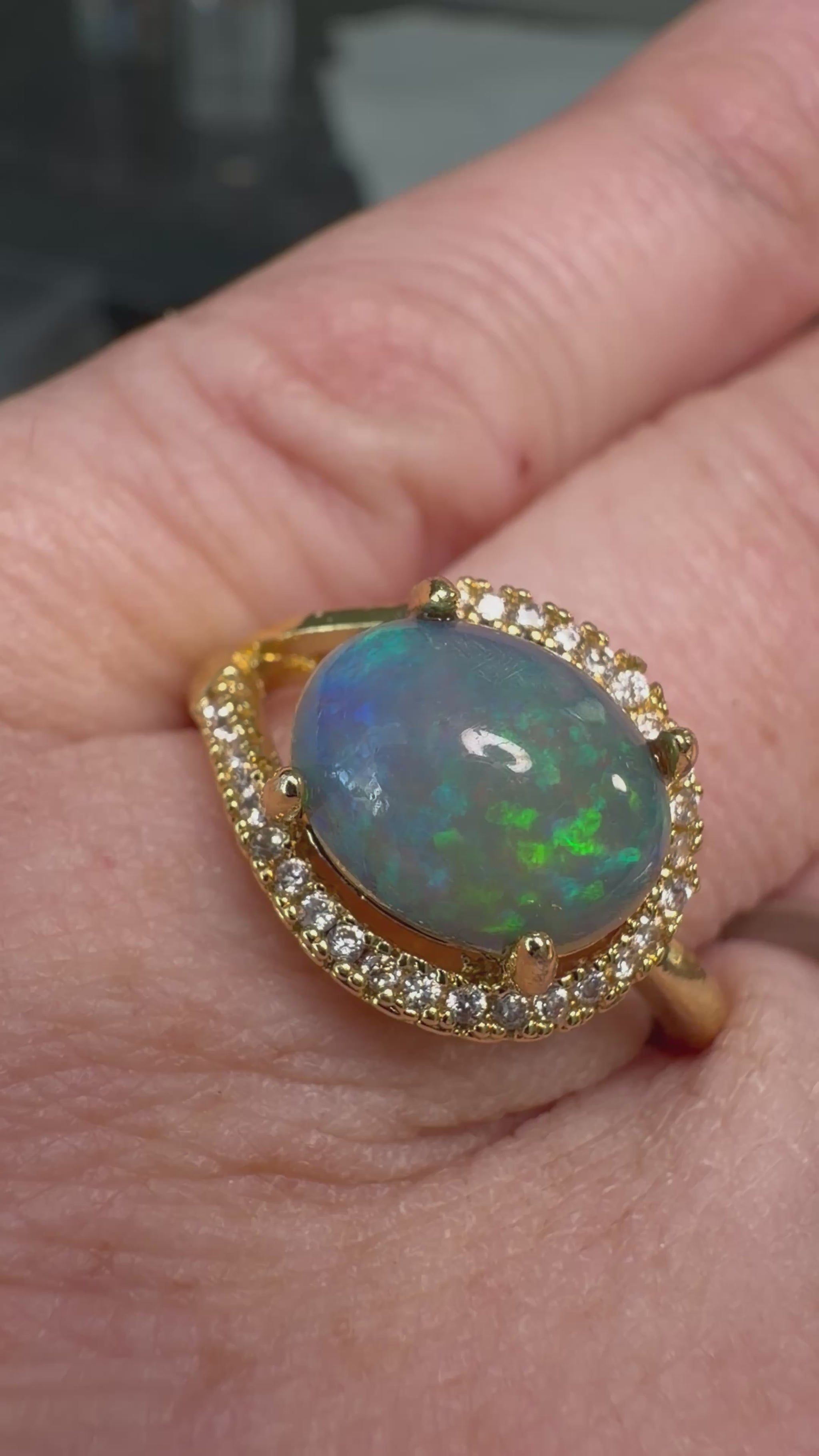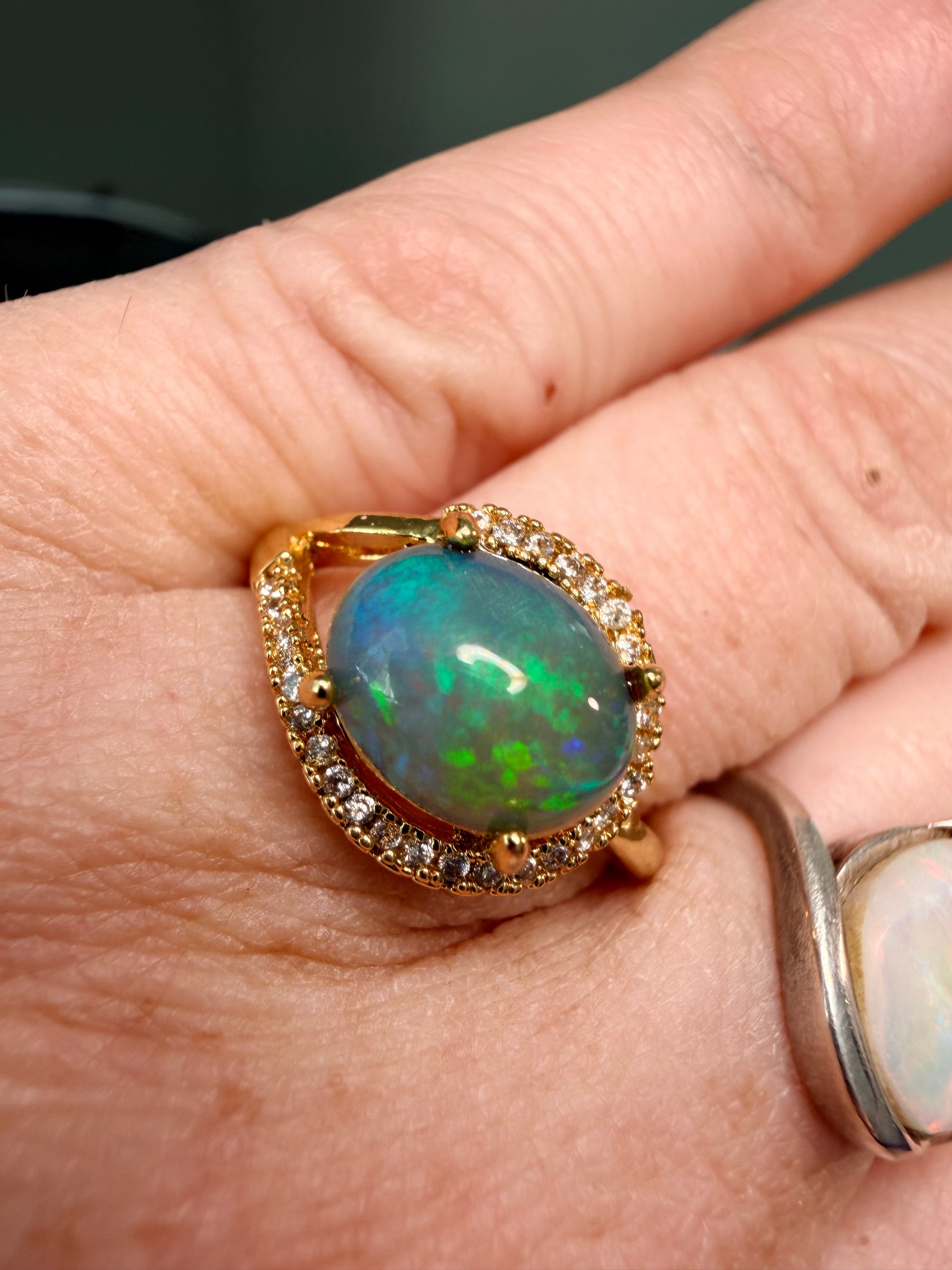 1.9 carat Ethiopian opal adjustable ring in gold plated over brass setting. Blue and green flash throughout stone stone size is approx. 10mm x 7.7mm. Reminder, I'm not a jeweler and these rings were originally made for just me. I prefer the stones natural looking with possible matrix, inclusions or some polishing scratches. These are all created from rough rocks that I grind and polish into cabs. Ethiopian opals are hydrophane, meaning they will absorb water. It’s recommended to take these off when showering, washing hands, etc.