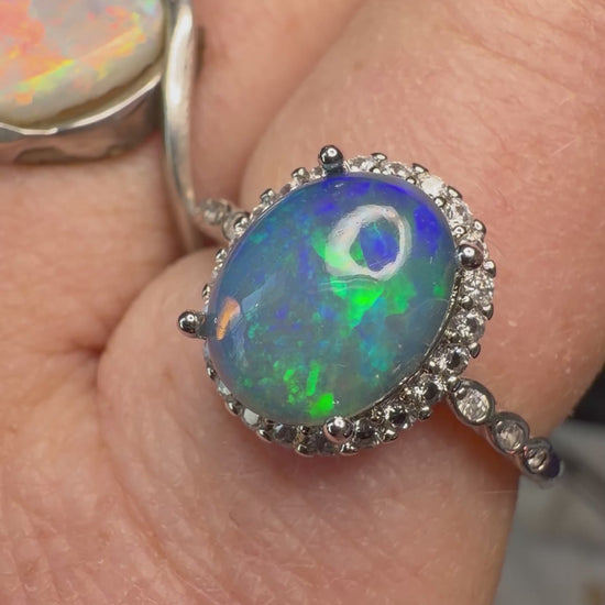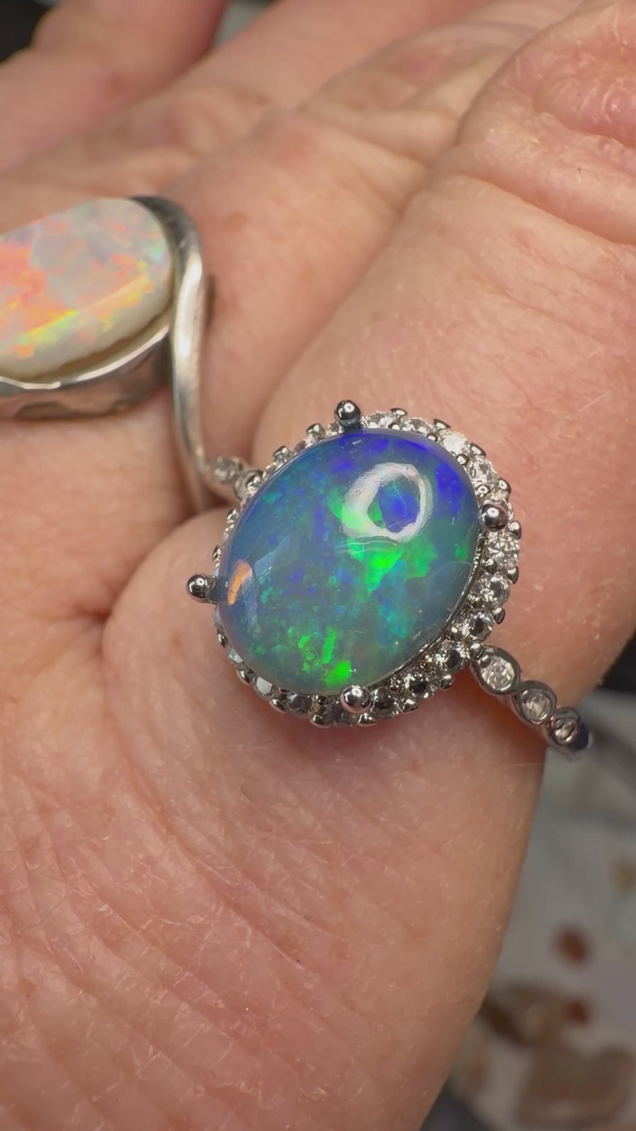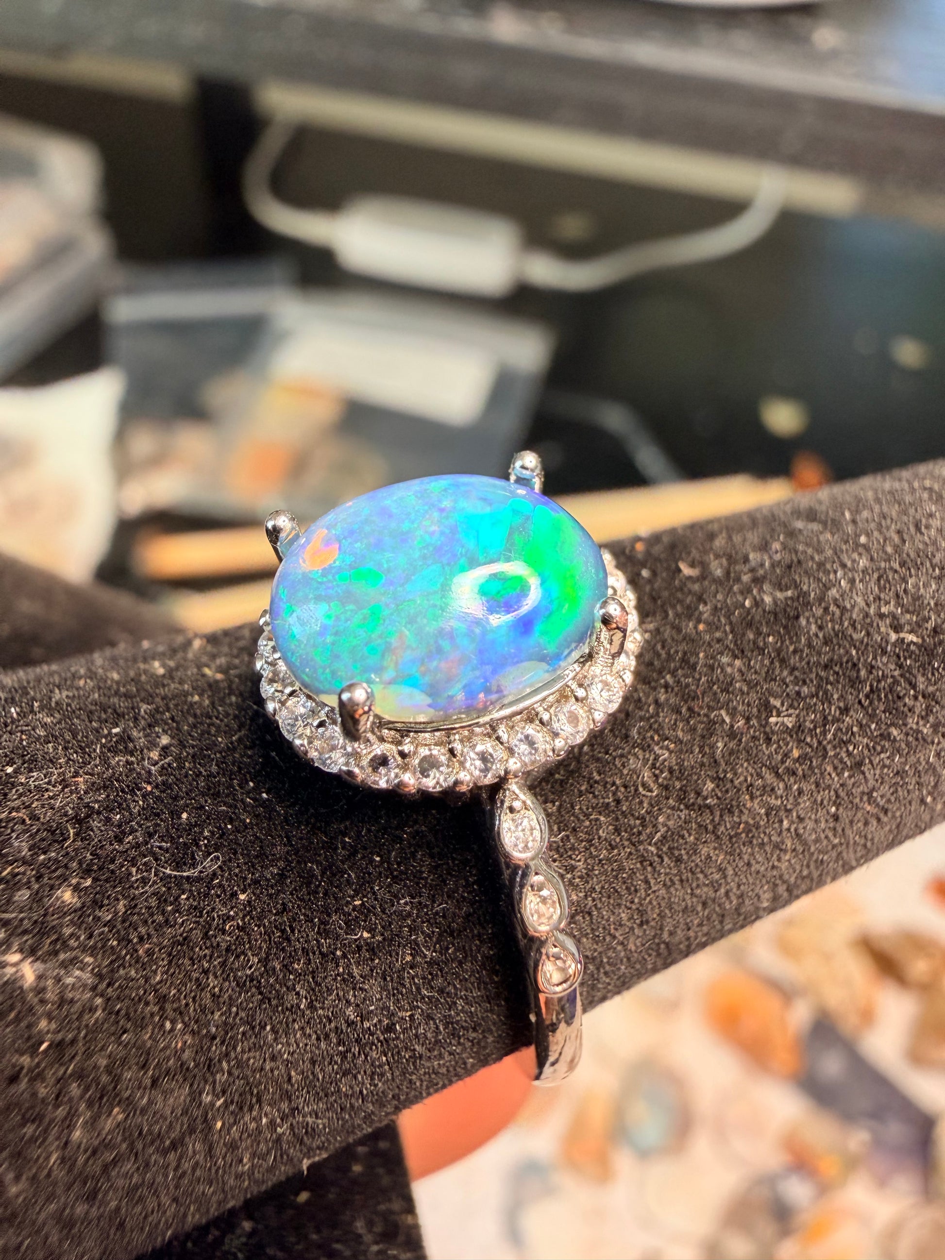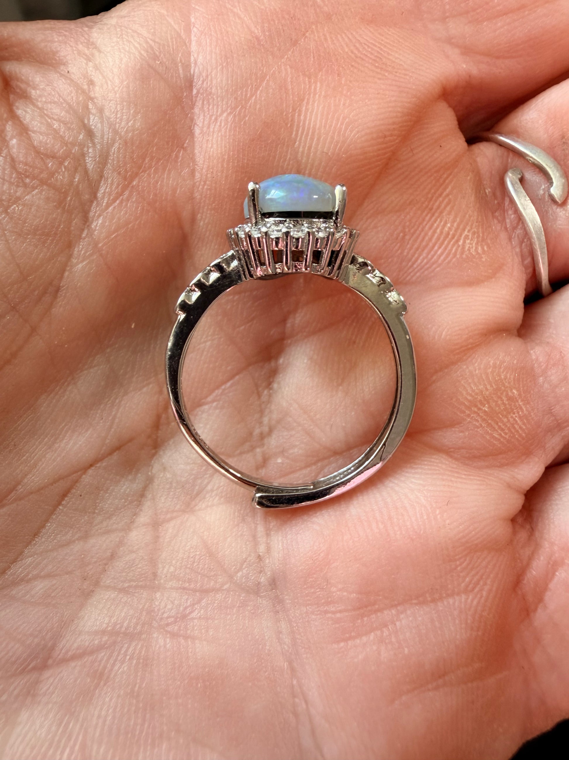 1.9 carat Ethiopian opal adjustable ring in 925 setting. Super blue with honeycomb pattern at bottom and covered in confetti pattern. Stone size is approx. 10.1mm x 7.9mm. Reminder, I'm not a jeweler and these rings were originally made for just me. I prefer the stones natural looking with possible matrix, inclusions or some polishing scratches. These are all created from rough rocks that I grind and polish into cabs. Ethiopian opals are hydrophane, meaning they will absorb water. It’s recommended to take these off when showering, washing hands, etc.