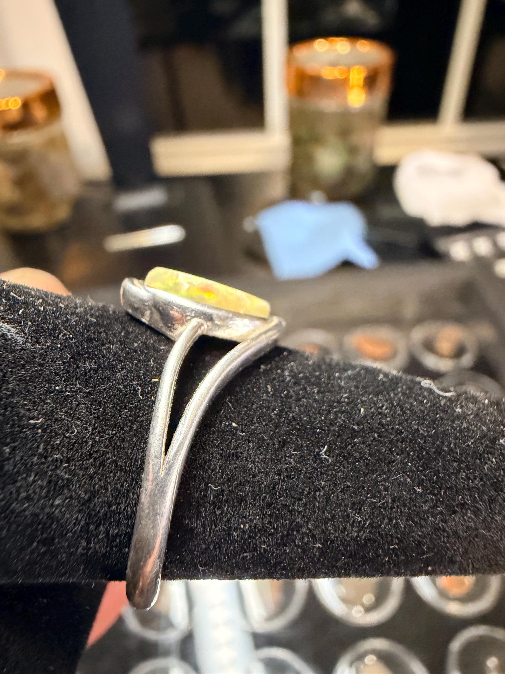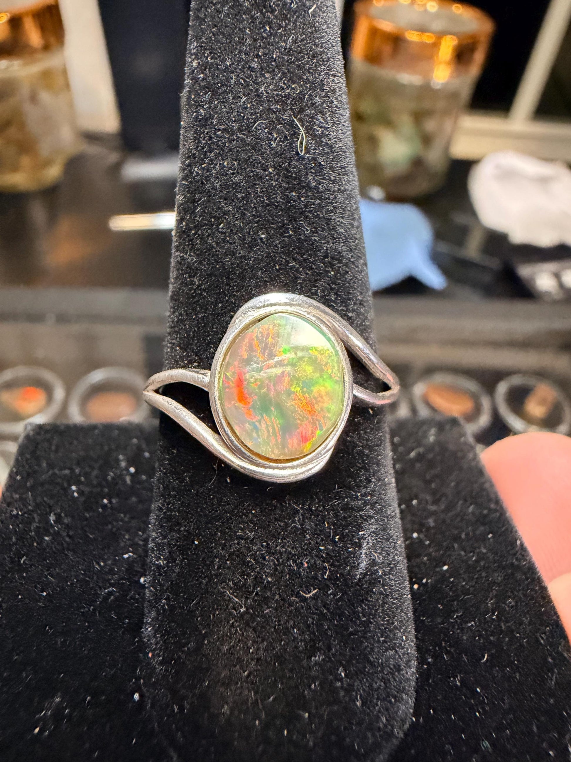2.1 carat Ethiopian opal adjustable ring. Ring is 925 silver and adjustable. I’m not a jeweler, only a hobbyist so these opals and rings aren’t perfect. They may have matrix, inclusions, or polishing marks on the stones. Please look at all photos and videos, I try to show everything about the stones.