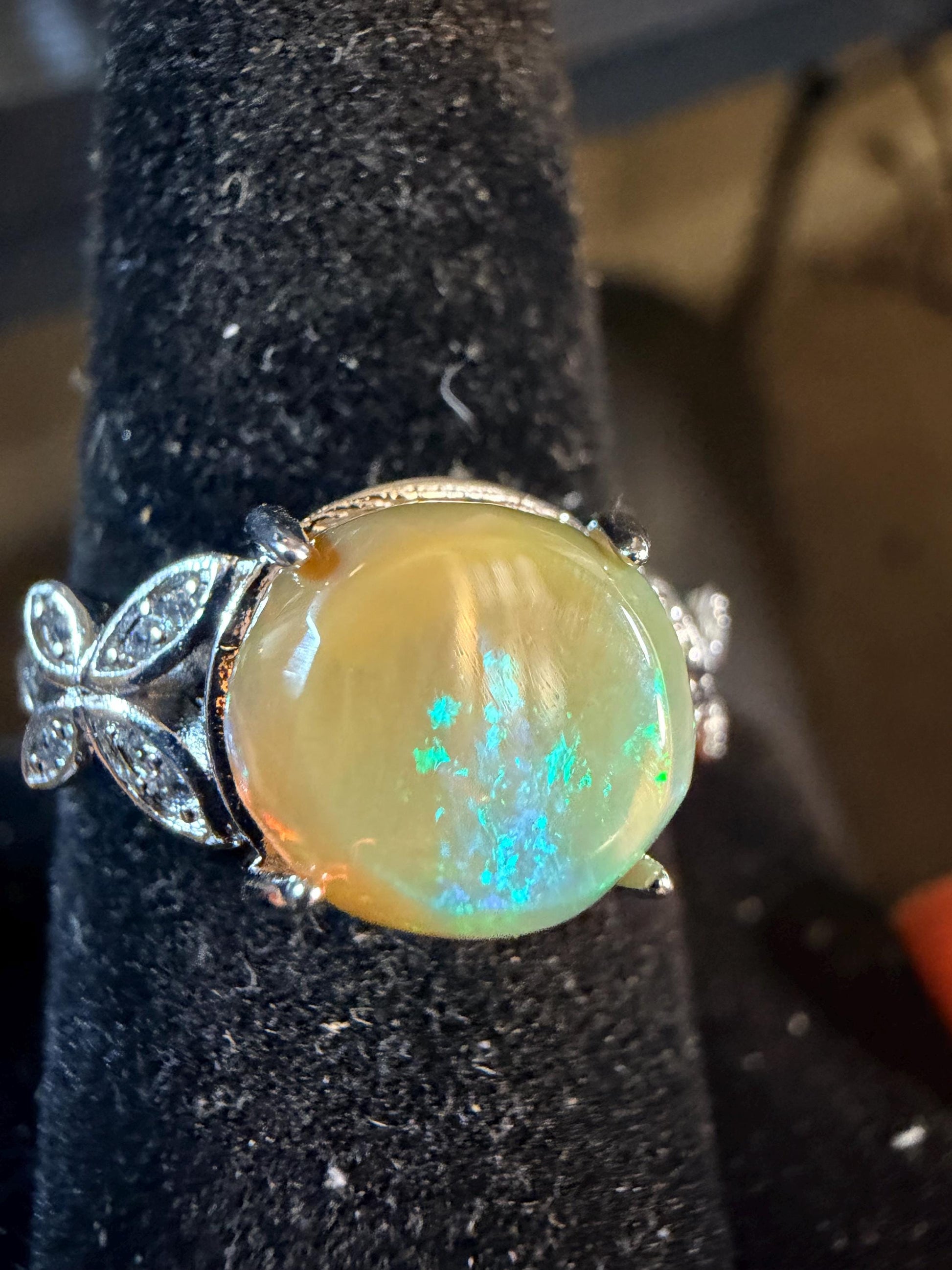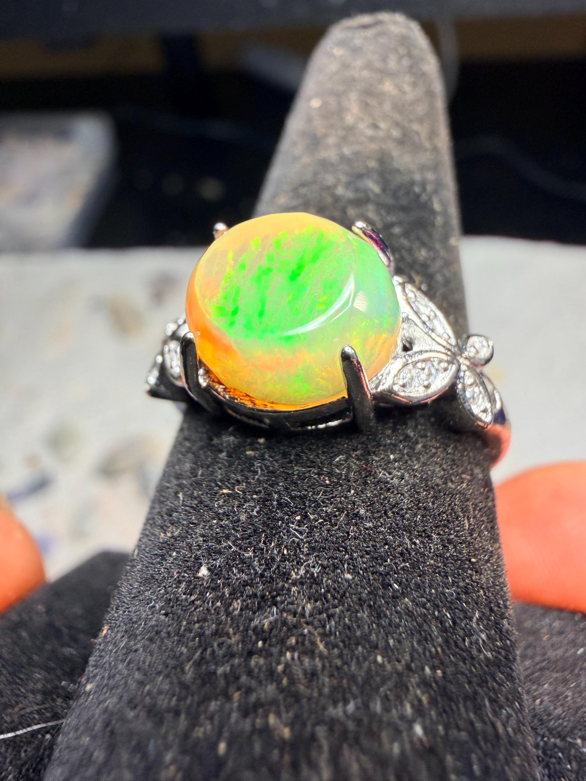 2.3 carat Ethiopian opal adjustable ring. The stone is approx. 10mm. Has any amazing honeycomb pattern running through the stone. Reminder, I'm not a jeweler and these rings were originally made for just me. I prefer the stones natural looking with possible matrix, inclusions or some polishing scratches. These are all created from rough rocks that I grind and polish into cabs. Ethiopian opals are hydrophane, meaning they will absorb water. It’s recommended to take these off when showering, washing hands, etc.