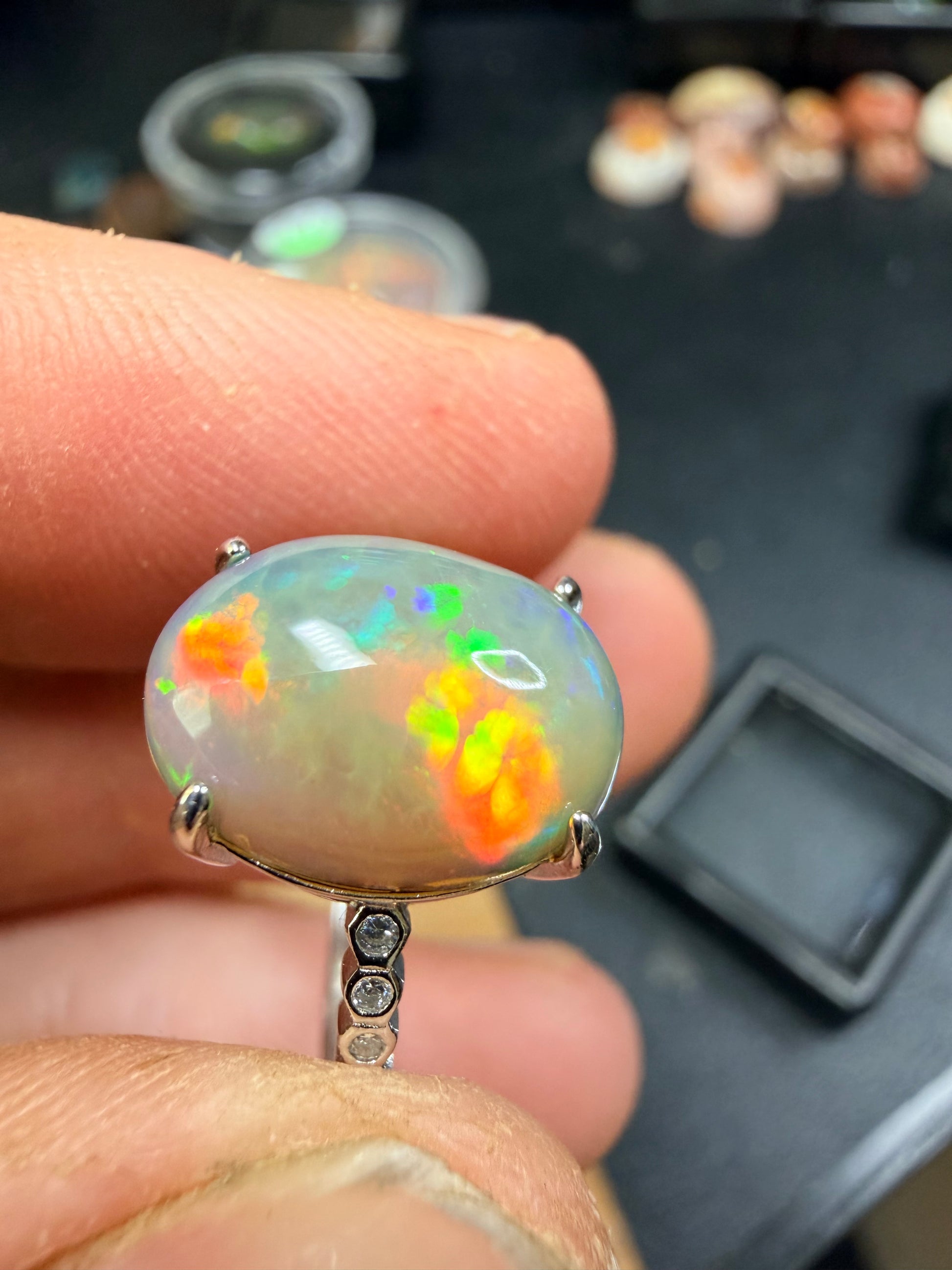2.8 carat all natural Ethiopian opal adjustable ring. Setting is 925 sterling silver. Honeycomb pattern in stone. Stone size is approx. 12.3mm x 9.2mm. Pictures taken under a $5 LED light and my iPhone. Reminder, I'm not a jeweler and these rings were originally made for just me. I prefer the stones natural looking with possible matrix, inclusions or some polishing scratches. These are all created from rough rocks that I grind and polish into cabs. Ethiopian opals are hydrophane, meaning they will absorb water. It’s recommended to take these off when showering, washing hands, etc.
