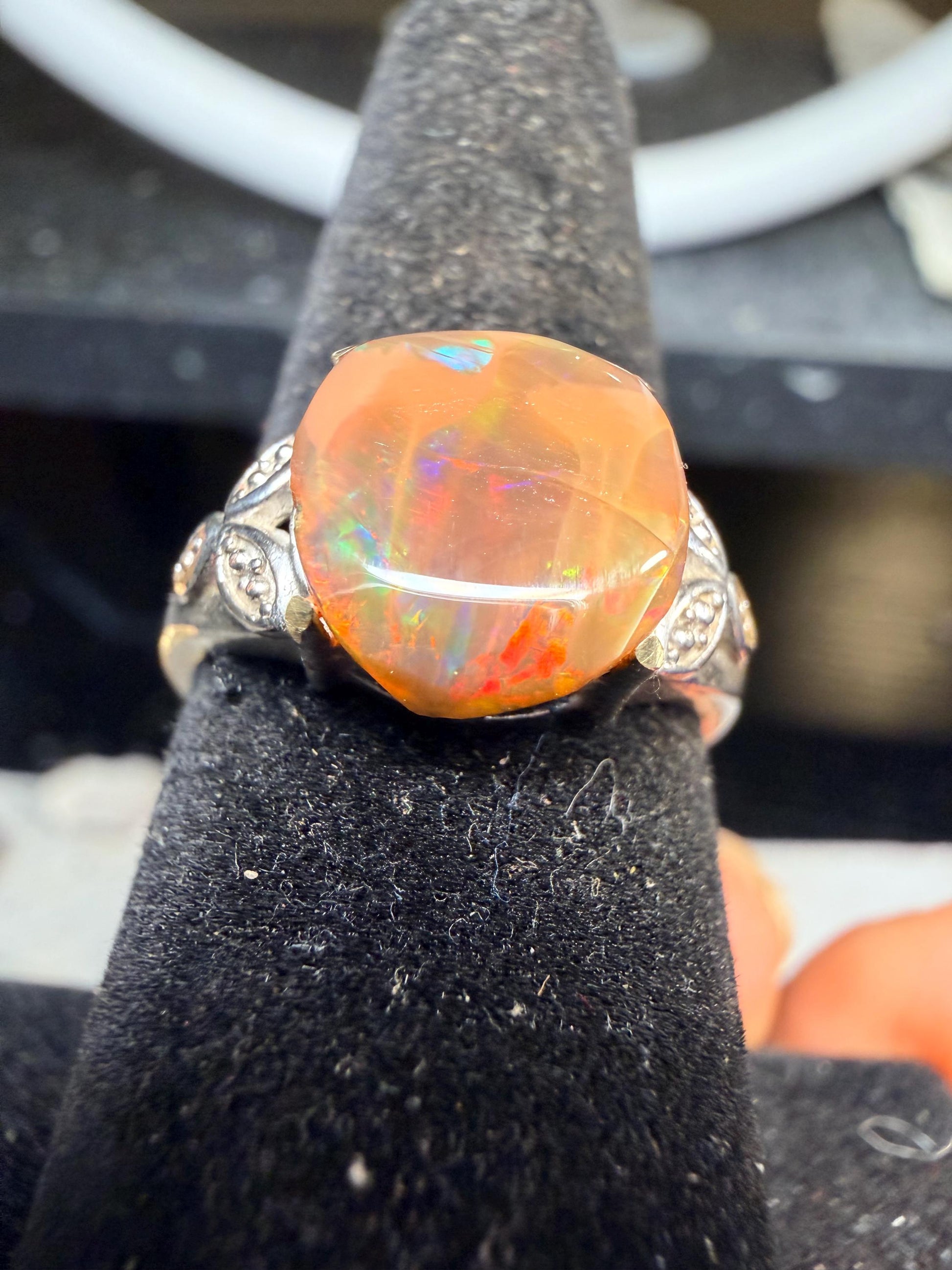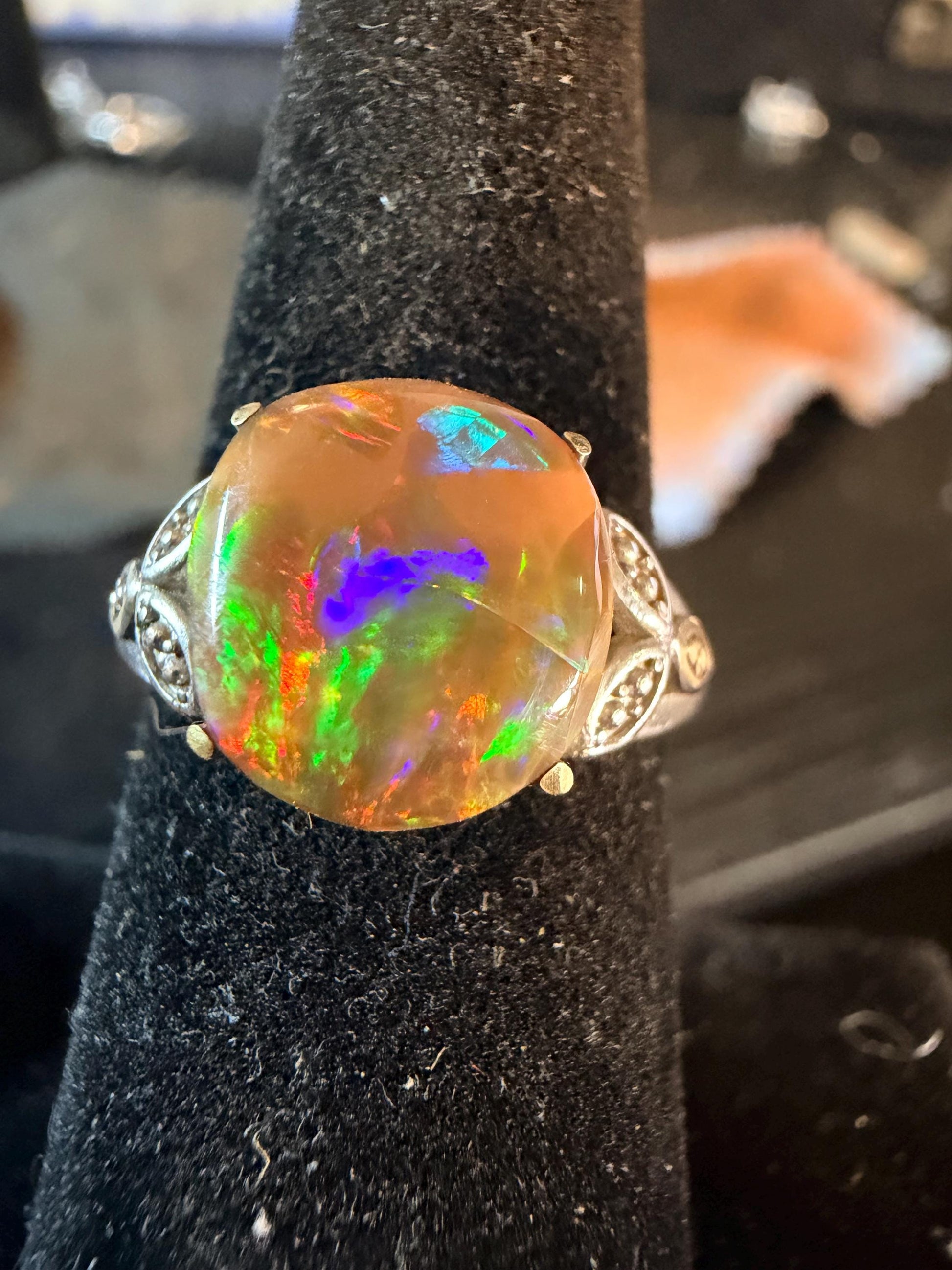 4.1 carat chocolate Ethiopian opal adjustable ring. Beautiful opal with stretch honeycomb pattern in a chocolate opal. Reminder, I'm not a jeweler and these rings were originally made for just me. I prefer the stones natural looking with possible matrix, inclusions or some polishing scratches. These are all created from rough rocks that I grind and polish into cabs. Ethiopian opals are hydrophane, meaning they will absorb water. It’s recommended to take these off when showering, washing hands, etc.