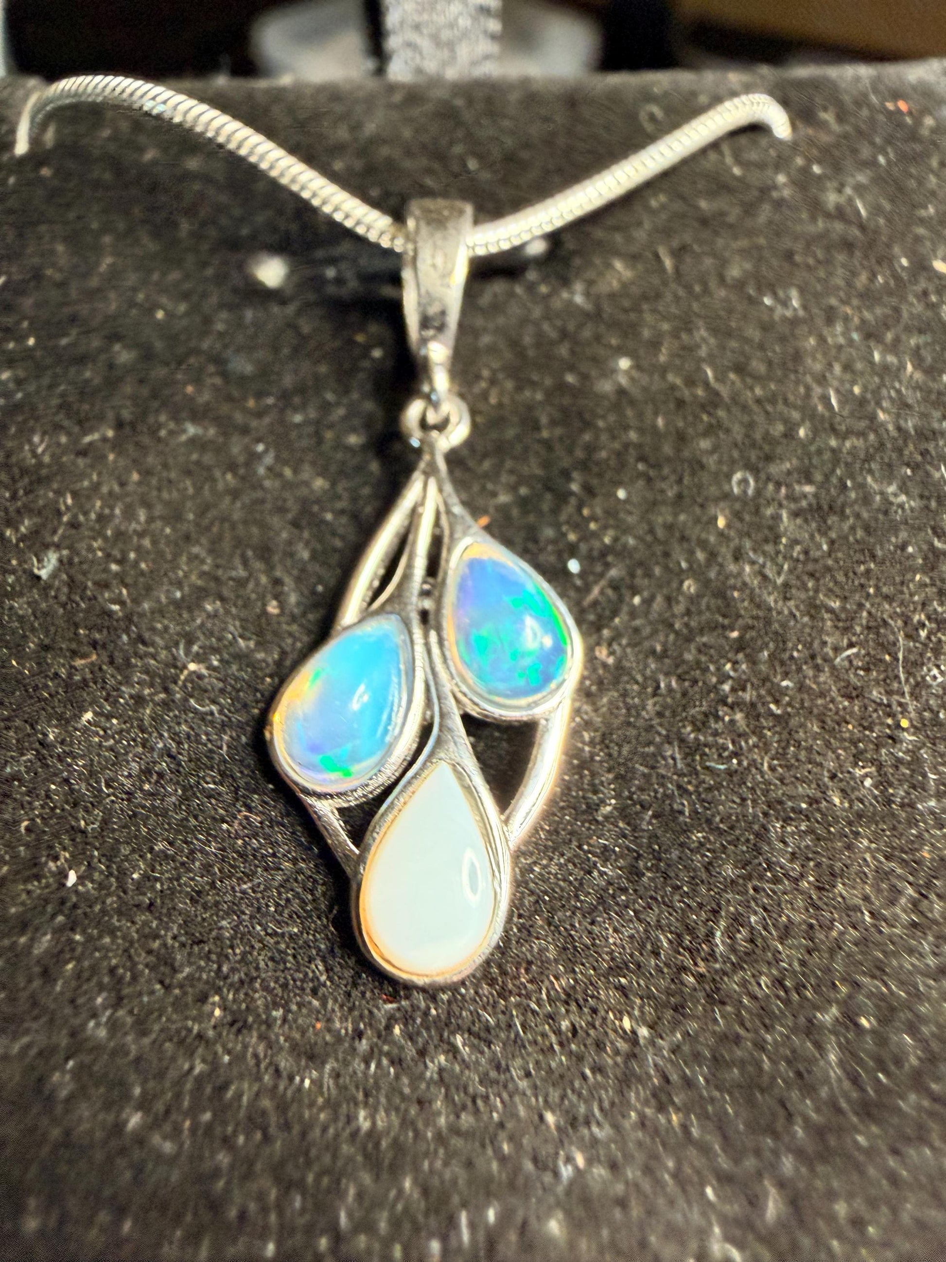 Beautiful 925 silver pendant with two teardrop Ethiopian opals and one Australian teardrop. Stone sizes are approx. 6.5mm x 3.8mm. Pendant comes with an 18” silver snake chain and gift box.