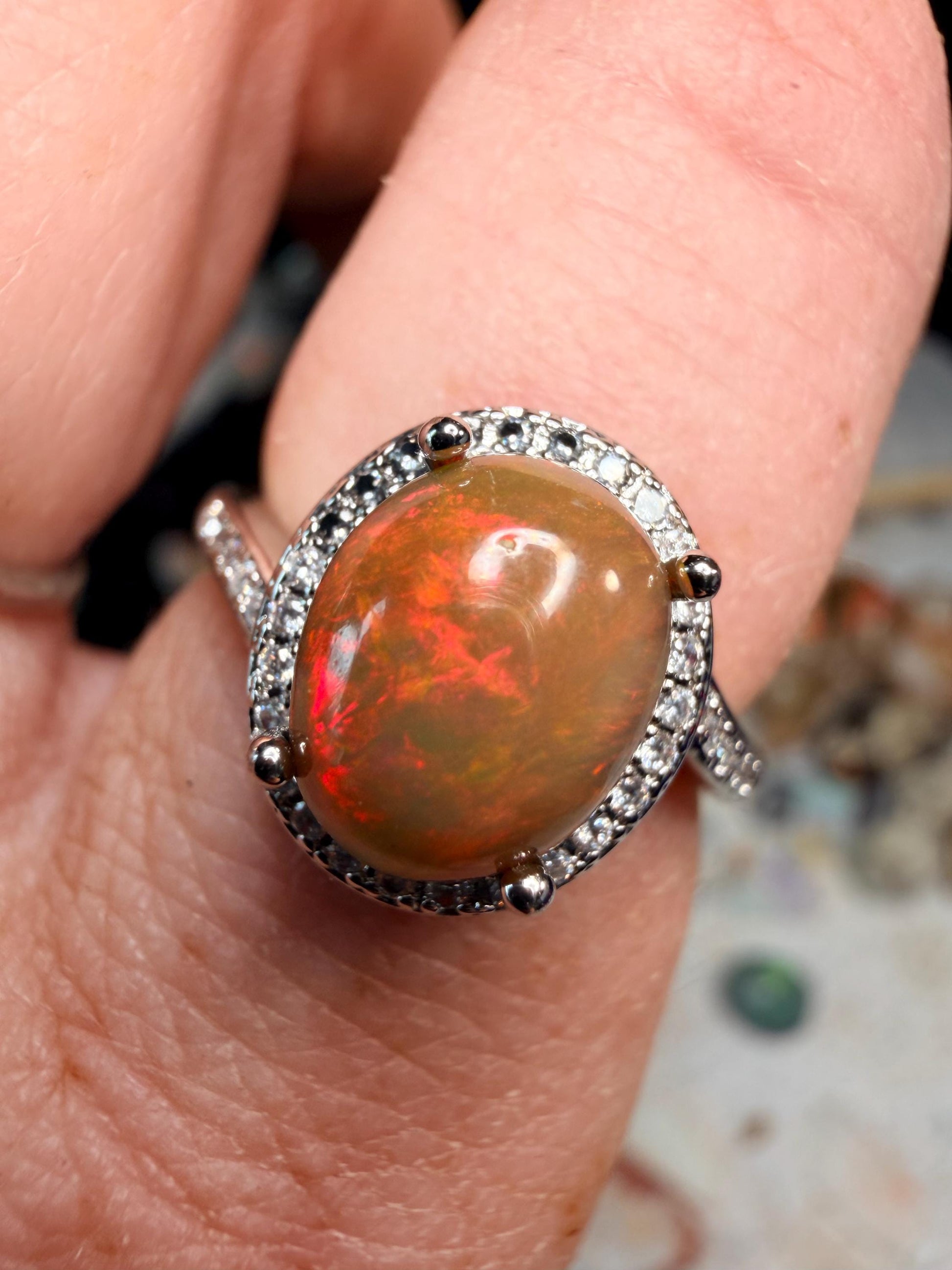 2.7 carat Ethiopian adjustable ring set in 925 silver. Stone size is approx. 10mm x 7.8mm. Reminder, I'm not a jeweler and these rings were originally made for just me. I prefer the stones natural looking with possible matrix, inclusions or some polishing scratches. These are all created from rough rocks that I grind and polish into cabs. Ethiopian opals are hydrophane, meaning they will absorb water. It’s recommended to take these off when showering, washing hands, etc.