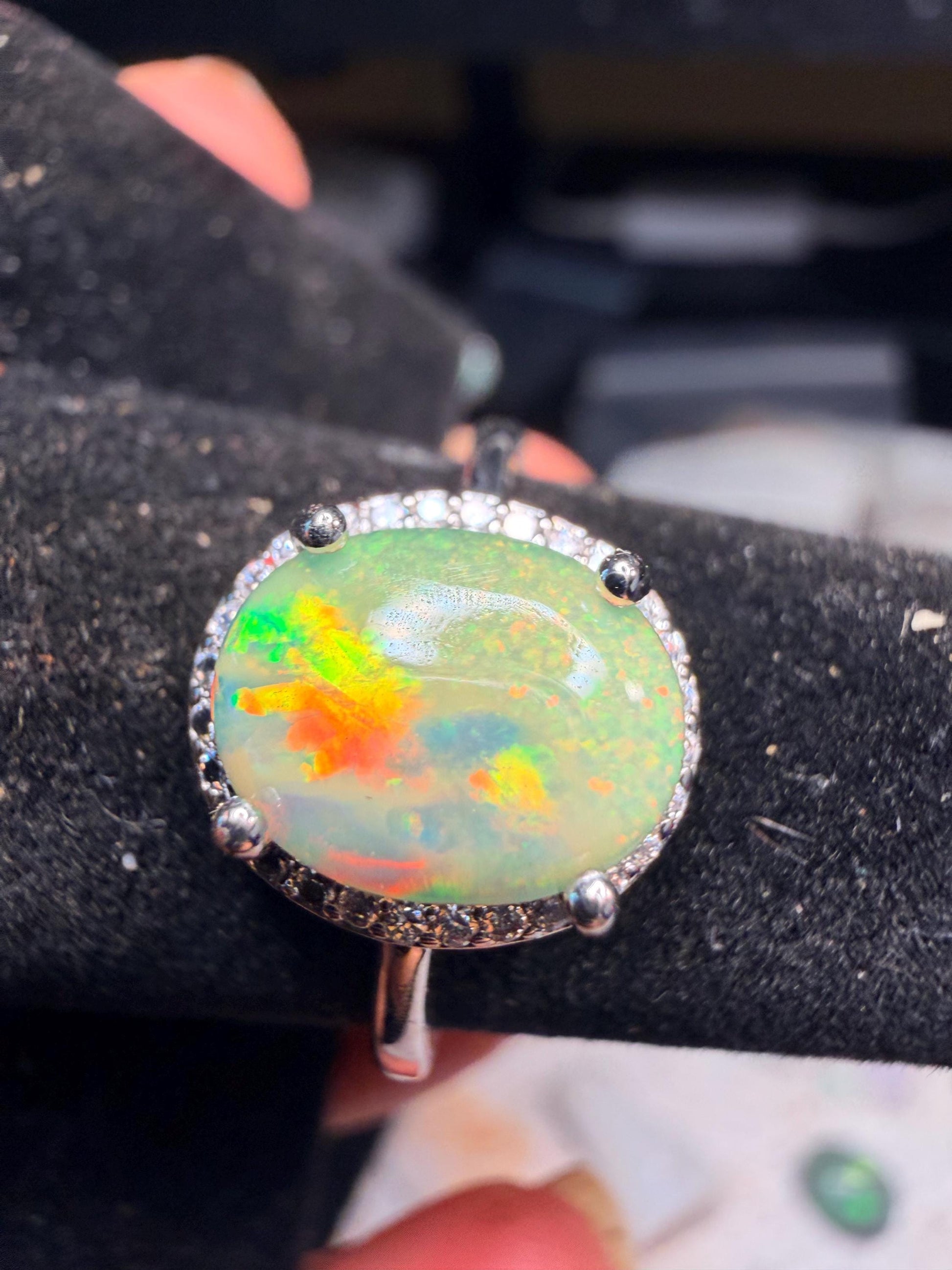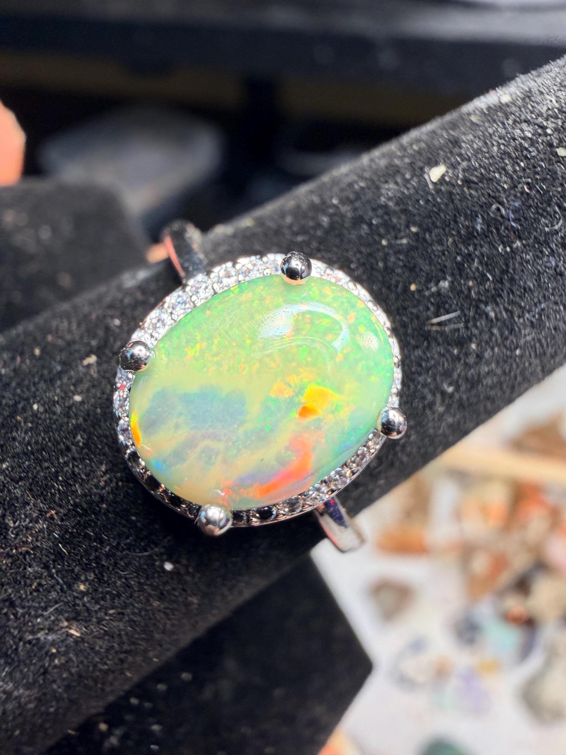 Beautiful half pinfire/half honeycomb Ethiopian opal adjustable ring. 2.4 carats in a 925 silver adjustable setting. Stone size is approx. 10.1mm x 8mm. Reminder, I'm not a jeweler and these rings were originally made for just me. I prefer the stones natural looking with possible matrix, inclusions or some polishing scratches. These are all created from rough rocks that I grind and polish into cabs. Ethiopian opals are hydrophane, meaning they will absorb water. It’s recommended to take these off when showering, washing hands, etc.
